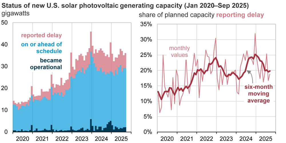 U.S. Energy Information Administration (EIA) — In the third quarter of 2025, solar projects representing about 20% of planned capacity reported a delay, a decrease from 25% in the same period in 2024, based on data compiled from multiple Preliminary Monthly Electric Generator Inventory reports.