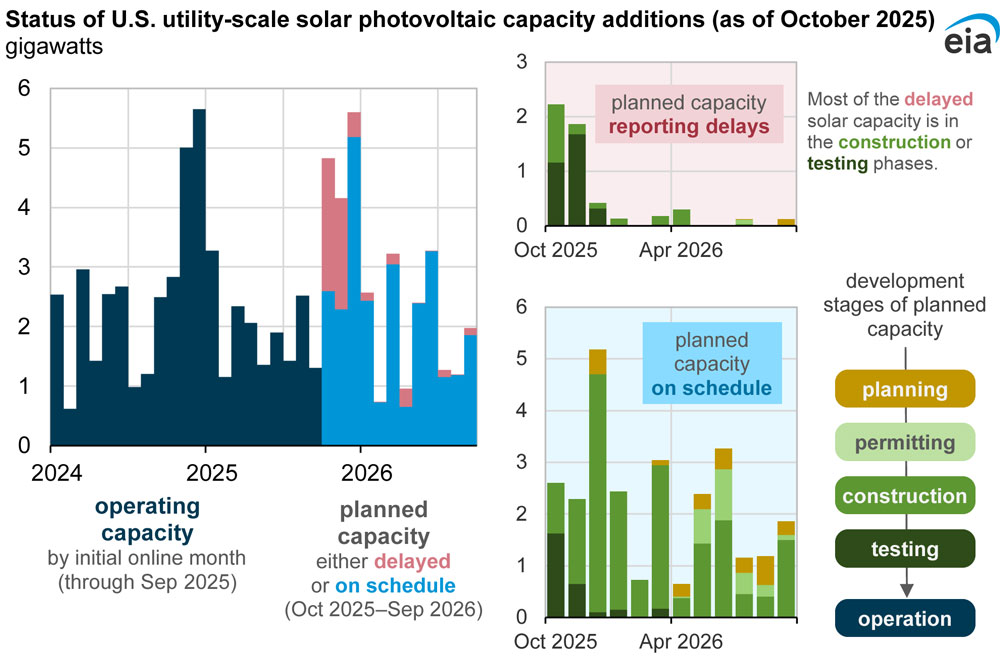 In our most recent monthly inventory of power plants, developers reported plans to bring 32 GW of solar capacity online in the next 12 months (October 2025 through September 2026). About 5 GW of that capacity is from solar projects that delayed their expected online date compared with what they had previously reported.