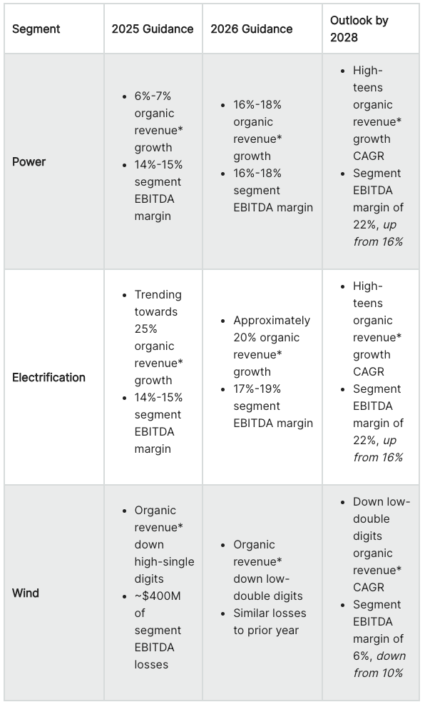 All outlooks exclude the impact of the acquisition of the remaining 50% stake of Prolec GE and any related financing, which is expected to close by mid-2026, subject to customary regulatory approvals.