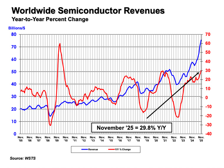 WASHINGTON — The Semiconductor Industry Association (SIA) today announced global semiconductor industry sales totaled $75.3 billion during the month of November 2025, an increase of 29.8% compared to the November 2024 total of $58.0 billion and 3.5% more than the October 2025 total of $72.7 billion. Monthly sales are compiled by the World Semiconductor Trade Statistics (WSTS) organization and represent a three-month moving average. SIA represents 99% of the U.S. semiconductor industry by revenue and nearly two-thirds of non-U.S. chip firms.